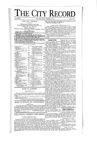The City Record newspaper publishes notices which includes but is not limited to: public hearings and meetings, public auctions and sales, solicitations and awards and official rules proposed and adopted by city agencies. This is the City Record Newspaper for December 22, 1911.