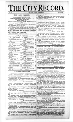 The City Record newspaper publishes notices which includes but is not limited to: public hearings and meetings, public auctions and sales, solicitations and awards and official rules proposed and adopted by city agencies. This is the City Record Newspaper for March 26, 1912.