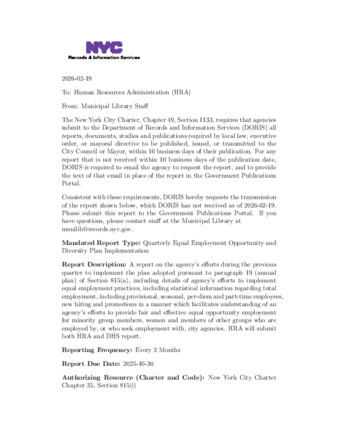 A report on the agency's efforts during the previous quarter to implement the plan adopted pursuant to paragraph 19 (annual plan) of Section 815(a), including details of agency's efforts to implement equal employment practices, including statistical information regarding total employment, including provisional, seasonal, per-diem and part-time employees, new hiring and promotions in a manner which facilitates understanding of an agency's efforts to provide fair and effective equal opportunity employment for minority group members, women and members of other groups who are employed by, or who seek employment with, city agencies. HRA will submit both HRA and DHS report.