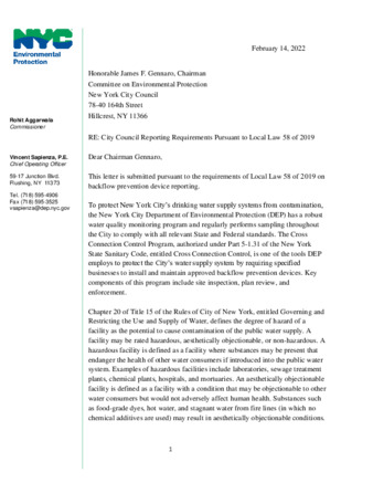 This report is submitted pursuant to the requirements of Local Law 58 of 2019 on backflow prevention device reporting.