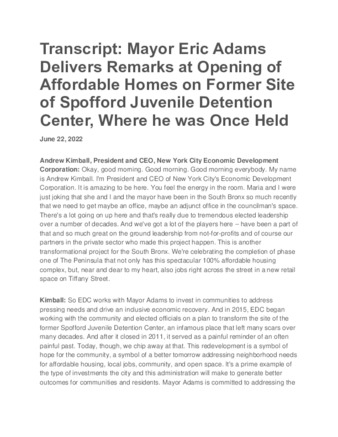 Transcript: Mayor Eric Adams Delivers Remarks at Opening of Affordable Homes on Former Site of Spofford Juvenile Detention Center