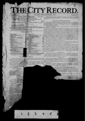 The City Record newspaper publishes notices which includes but is not limited to: public hearings and meetings, public auctions and sales, solicitations and awards and official rules proposed and adopted by city agencies. This is the City Record Newspaper for September 01, 1903.