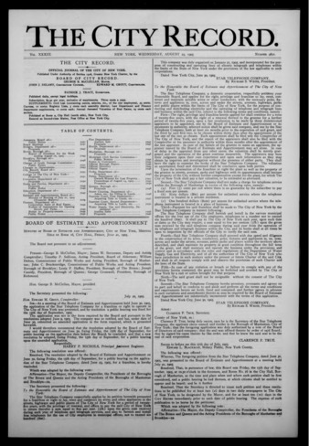 The City Record newspaper publishes notices which includes but is not limited to: public hearings and meetings, public auctions and sales, solicitations and awards and official rules proposed and adopted by city agencies. This is the City Record Newspaper for August 23, 1905.