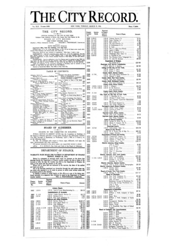 The City Record newspaper publishes notices which includes but is not limited to: public hearings and meetings, public auctions and sales, solicitations and awards and official rules proposed and adopted by city agencies. This is the City Record Newspaper for March 31, 1914 with supplement.