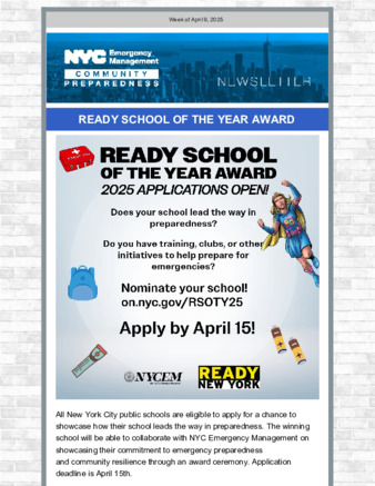 The NYCEM Community Preparedness newsletter provides information about preparedness initiatives, resources and local events to community and faith-based organizations, leaders and the general public of New York City. During emergencies, important alerts and updates are issued to all who subscribe.