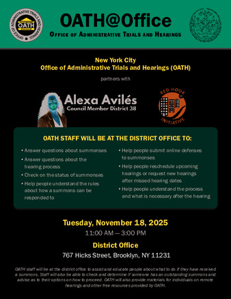 OATH staff were at the district office to assist and educate people about what to do should they have received a summons and to check to determine if someone has an outstanding summons. Materials about remote hearings and other free resources were provided to the public as well.