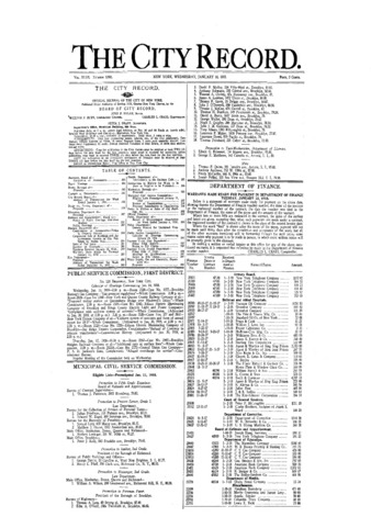 The City Record newspaper publishes notices which includes but is not limited to: public hearings and meetings, public auctions and sales, solicitations and awards and official rules proposed and adopted by city agencies. This is the City Record Newspaper for January 16, 1918.