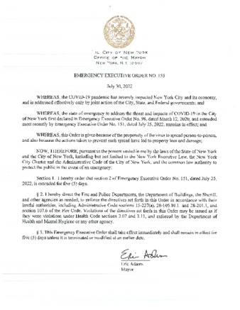Emergency Executive Order No. 155, extends Emergency Executive Order No. 151, dated July 25, 2022, for five (5) days, if this relates to COVID-19 pandemic.