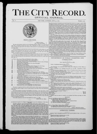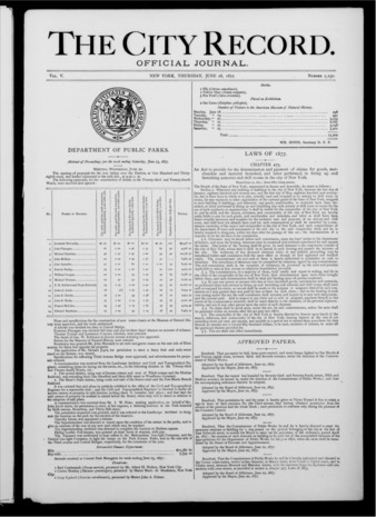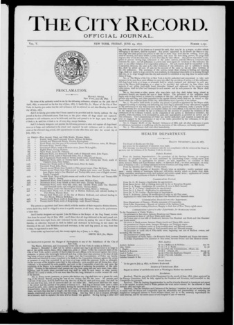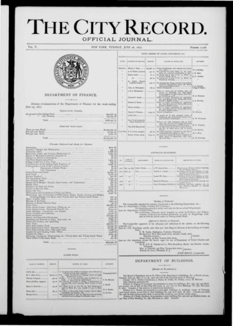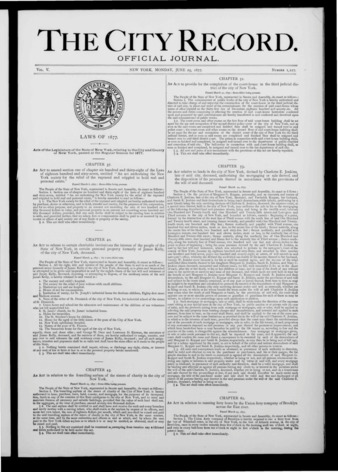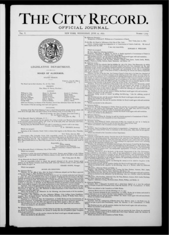 The City Record newspaper publishes notices which includes but is not limited to: public hearings and meetings, public auctions and sales, solicitations and awards and official rules proposed and adopted by city agencies. This is the City Record Newspapers for June 1877.