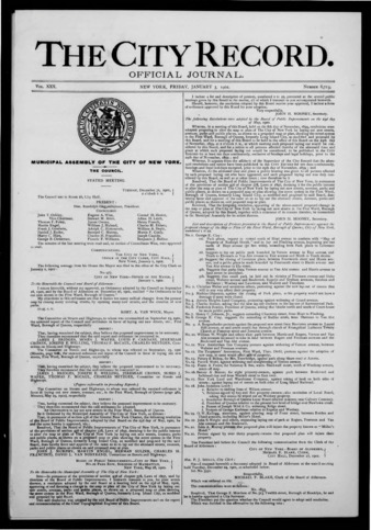 The City Record newspaper publishes notices which includes but is not limited to: public hearings and meetings, public auctions and sales, solicitations and awards and official rules proposed and adopted by city agencies. This is the City Record Newspaper for January 03, 1902.