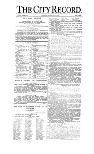 The City Record newspaper publishes notices which includes but is not limited to: public hearings and meetings, public auctions and sales, solicitations and awards and official rules proposed and adopted by city agencies. This is the City Record Newspaper for July 02, 1914.