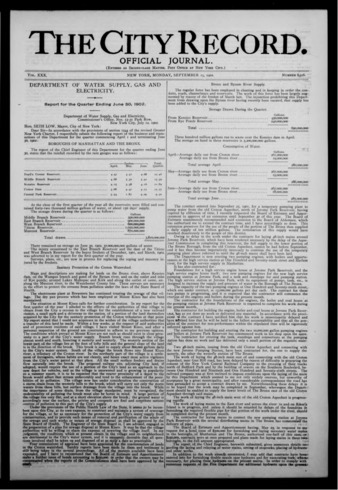 The City Record newspaper publishes notices which includes but is not limited to: public hearings and meetings, public auctions and sales, solicitations and awards and official rules proposed and adopted by city agencies. This is the City Record Newspaper for September 15, 1902.
