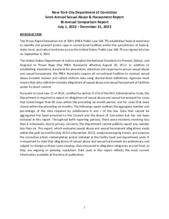 Pursuant to Local Law 21, this report provides information on allegations of sexual abuse and sexual harassment in city jails for cases that lasted longer than 90 days within the preceding six-month period, and cases that concluded during the preceding six-month period.