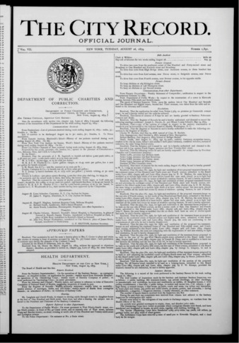 The City Record newspaper publishes notices which includes but is not limited to: public hearings and meetings, public auctions and sales, solicitations and awards and official rules proposed and adopted by city agencies. This is the City Record Newspaper for August 26, 1879.