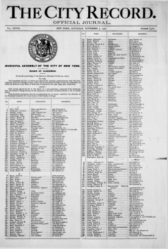 The City Record newspaper publishes notices which includes but is not limited to: public hearings and meetings, public auctions and sales, solicitations and awards and official rules proposed and adopted by city agencies. This is the City Record Newspaper for November 03, 1900.