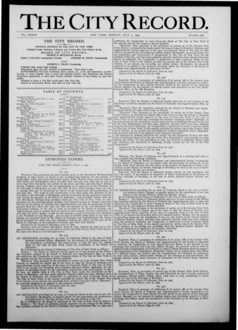 The City Record newspaper publishes notices which includes but is not limited to: public hearings and meetings, public auctions and sales, solicitations and awards and official rules proposed and adopted by city agencies. This is the City Record Newspaper for July 03, 1905.