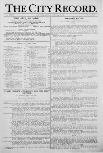 The City Record newspaper publishes notices which includes but is not limited to: public hearings and meetings, public auctions and sales, solicitations and awards and official rules proposed and adopted by city agencies. This is the City Record Newspaper for February 15, 1909.