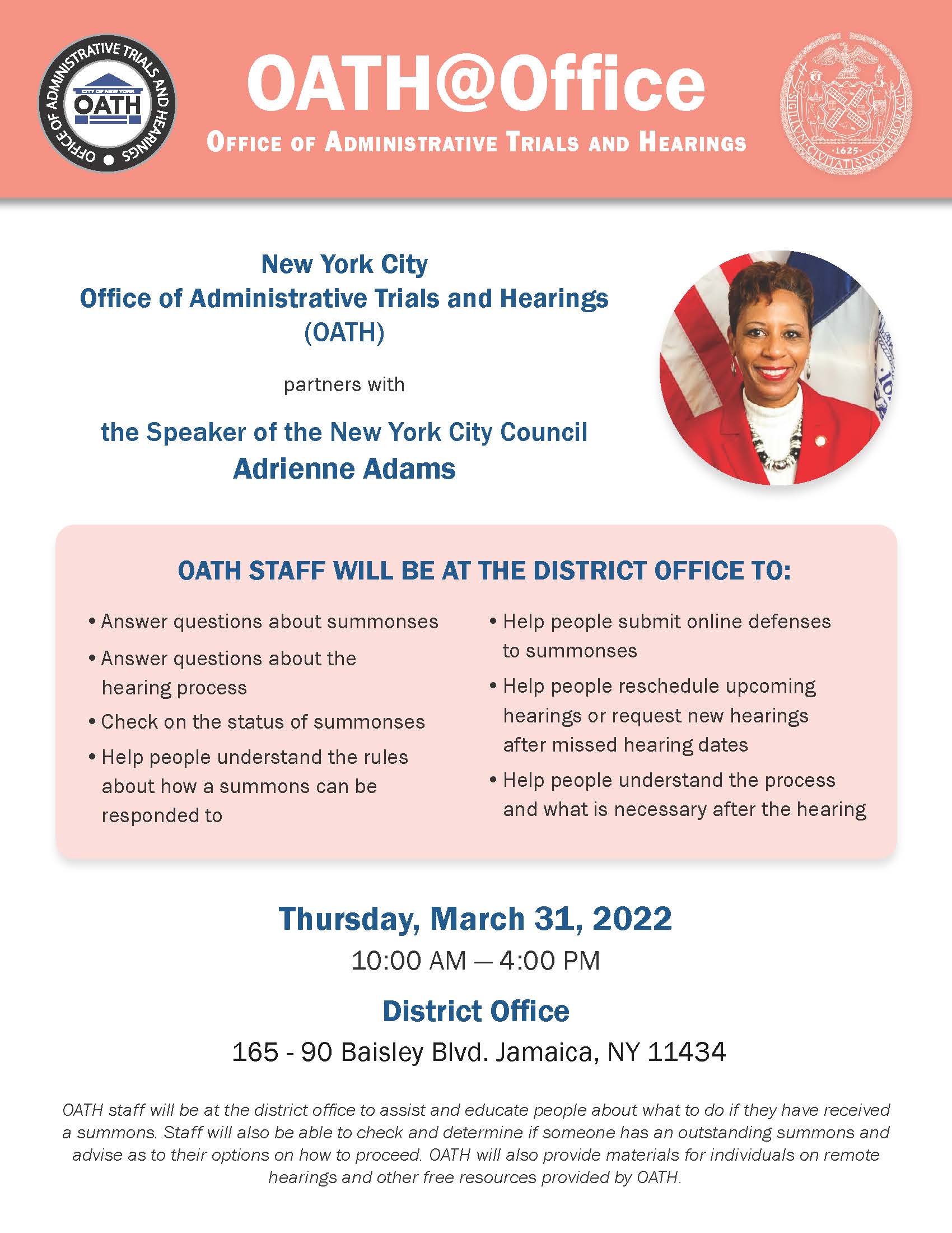 OATH staff were at the district office to assist and educate people about what to do should they have received a summons and to check to determine if someone has an outstanding summons. Materials about remote hearings and other free resources were provided to the public as well.