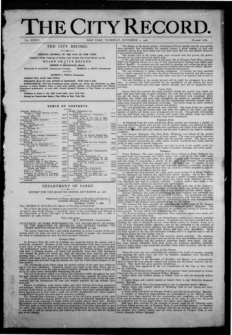 The City Record newspaper publishes notices which includes but is not limited to: public hearings and meetings, public auctions and sales, solicitations and awards and official rules proposed and adopted by city agencies. This is the City Record Newspaper for November 01, 1906.