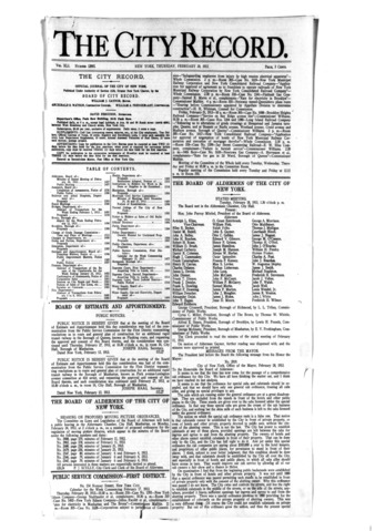The City Record newspaper publishes notices which includes but is not limited to: public hearings and meetings, public auctions and sales, solicitations and awards and official rules proposed and adopted by city agencies. This is the City Record Newspaper for February 20, 1913.