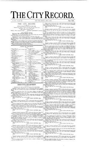 The City Record newspaper publishes notices which includes but is not limited to: public hearings and meetings, public auctions and sales, solicitations and awards and official rules proposed and adopted by city agencies. This is the City Record Newspaper for April 12, 1914 with supplement.