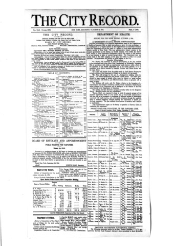 The City Record newspaper publishes notices which includes but is not limited to: public hearings and meetings, public auctions and sales, solicitations and awards and official rules proposed and adopted by city agencies. This is the City Record Newspaper for October 10, 1914 with supplement.