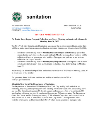 The New York City Department of Sanitation announced that in observance of Juneteenth, there will be no trash, recycling or compost collection, nor street cleaning, on Monday, June 20, 2022.