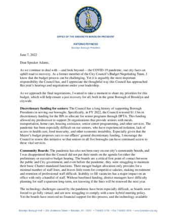 Brooklyn Borough President Antonio Reynoso's Letter to Speaker Adams in Response to Mayor's Executive Budget for FY2023.