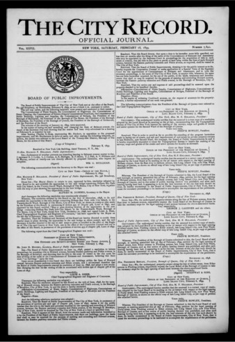 The City Record newspaper publishes notices which includes but is not limited to: public hearings and meetings, public auctions and sales, solicitations and awards and official rules proposed and adopted by city agencies. This is the City Record Newspaper for February 18, 1899.