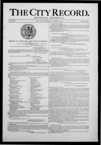 The City Record newspaper publishes notices which includes but is not limited to: public hearings and meetings, public auctions and sales, solicitations and awards and official rules proposed and adopted by city agencies. This is the City Record Newspaper for October 02, 1901.