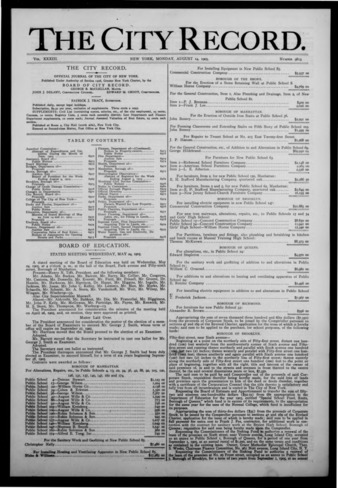 The City Record newspaper publishes notices which includes but is not limited to: public hearings and meetings, public auctions and sales, solicitations and awards and official rules proposed and adopted by city agencies. This is the City Record Newspaper for August 14, 1905.