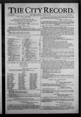 The City Record newspaper publishes notices which includes but is not limited to: public hearings and meetings, public auctions and sales, solicitations and awards and official rules proposed and adopted by city agencies. This is the City Record Newspaper for October 18, 1906.