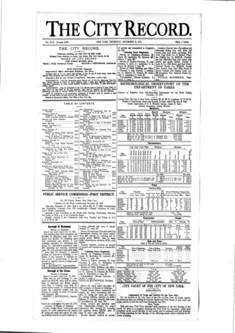 The City Record newspaper publishes notices which includes but is not limited to: public hearings and meetings, public auctions and sales, solicitations and awards and official rules proposed and adopted by city agencies. This is the City Record Newspaper for December 31, 1914 with supplement.