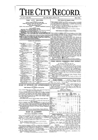 The City Record newspaper publishes notices which includes but is not limited to: public hearings and meetings, public auctions and sales, solicitations and awards and official rules proposed and adopted by city agencies. This is the City Record Newspaper for March 19, 1915.