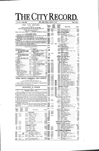 The City Record newspaper publishes notices which includes but is not limited to: public hearings and meetings, public auctions and sales, solicitations and awards and official rules proposed and adopted by city agencies. This is the City Record Newspaper for August 27, 1915.
