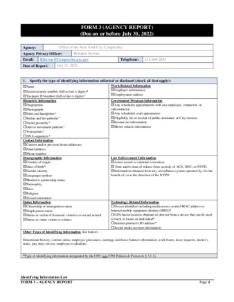 The Identifying Information Law requires City agencies to submit comprehensive biennial agency reports (Form 3). This document is related to the City Comptroller's collection, disclosure, and retention of identifying information and privacy protection practices.