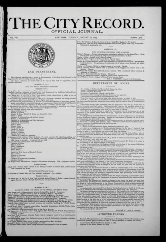 The City Record newspaper publishes notices which includes but is not limited to: public hearings and meetings, public auctions and sales, solicitations and awards and official rules proposed and adopted by city agencies. This is the City Record Newspaper for January 28, 1879.