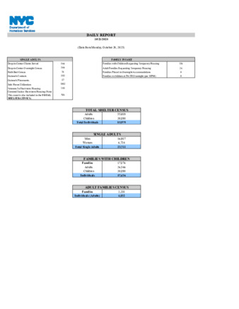 The Daily Shelter Census report contains statistics for the prior calendar day immediately preceding such weekday, excluding holidays. Reports various statistics such as, but not limited to the number of individuals, families, children (disaggregated).