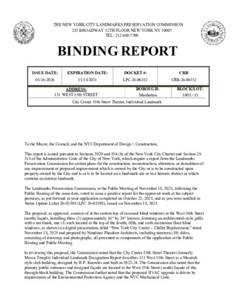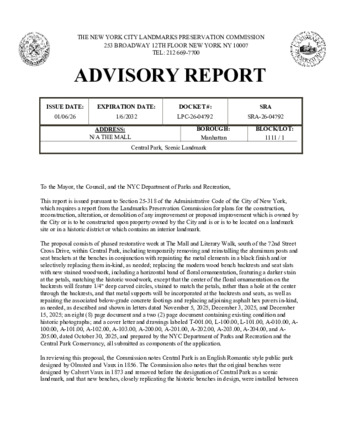 As required by the New York City Administrative Code, Title25, Section 318, the report containing the January 2026 Staff Level Reports or the Landmarks Preservation Commission