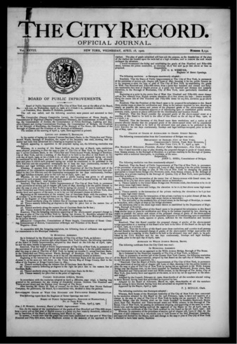 The City Record newspaper publishes notices which includes but is not limited to: public hearings and meetings, public auctions and sales, solicitations and awards and official rules proposed and adopted by city agencies. This is the City Record Newspaper for April 18, 1900.