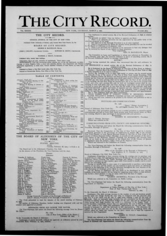 The City Record newspaper publishes notices which includes but is not limited to: public hearings and meetings, public auctions and sales, solicitations and awards and official rules proposed and adopted by city agencies. This is the City Record Newspaper for March 02, 1905.