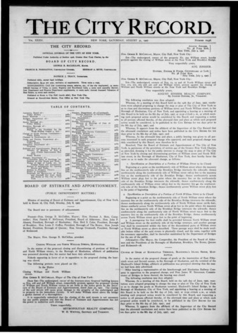 The City Record newspaper publishes notices which includes but is not limited to: public hearings and meetings, public auctions and sales, solicitations and awards and official rules proposed and adopted by city agencies. This is the City Record Newspaper for August 31, 1907.