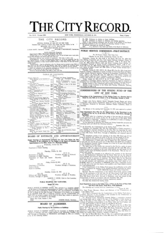 The City Record newspaper publishes notices which includes but is not limited to: public hearings and meetings, public auctions and sales, solicitations and awards and official rules proposed and adopted by city agencies. This is the City Record Newspaper for October 20, 1915.