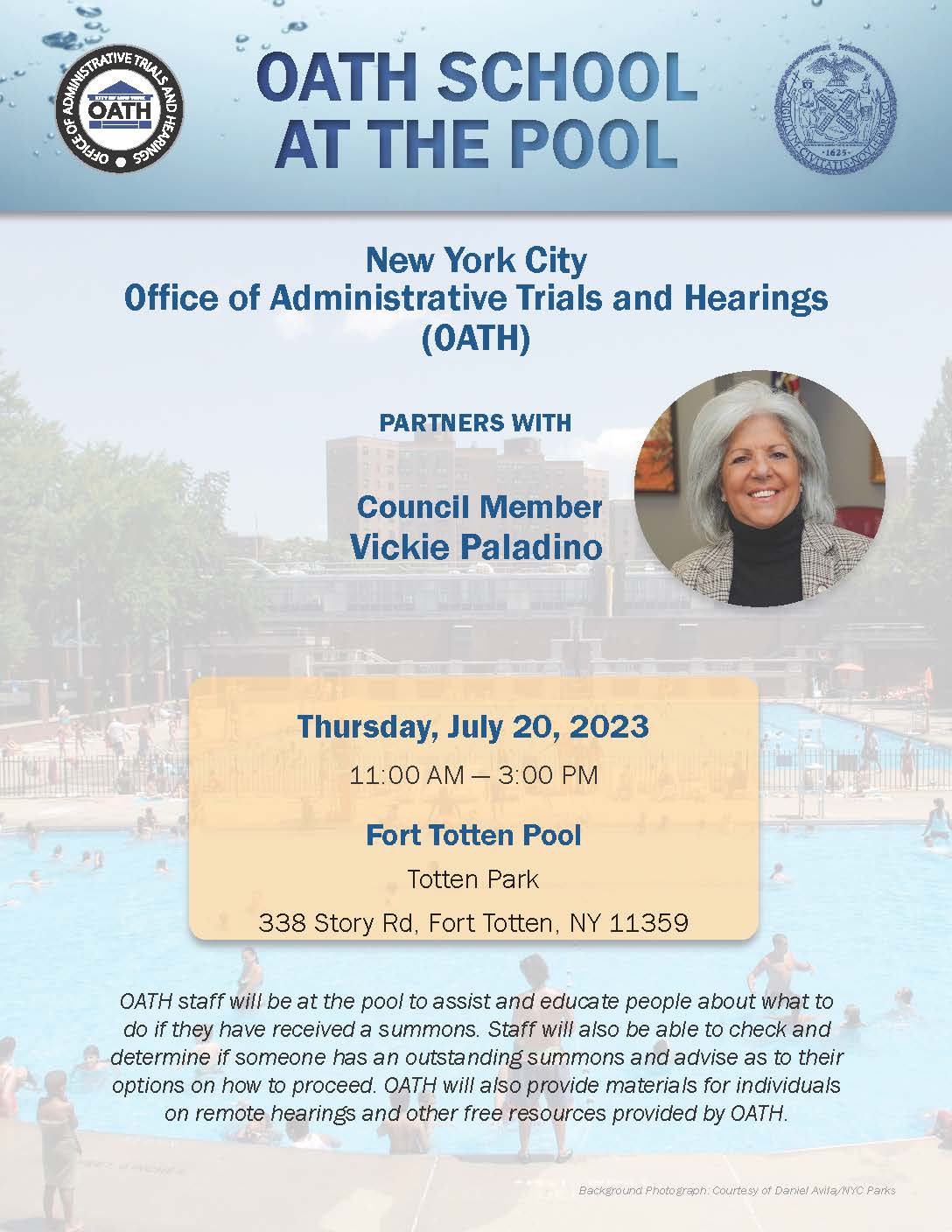 OATH staff were at the pool to assist and educate people about what to do should they have received a summons and to check to determine if someone has an outstanding summons. Materials about remote hearings and other free resources were provided to the public as well.