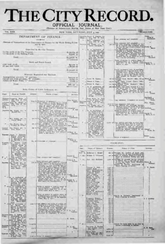 The City Record newspaper publishes notices which includes but is not limited to: public hearings and meetings, public auctions and sales, solicitations and awards and official rules proposed and adopted by city agencies. This is the City Record Newspaper for July 05, 1902.