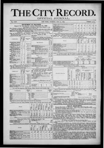 The City Record newspaper publishes notices which includes but is not limited to: public hearings and meetings, public auctions and sales, solicitations and awards and official rules proposed and adopted by city agencies. This is the City Record Newspaper for May 25, 1897.
