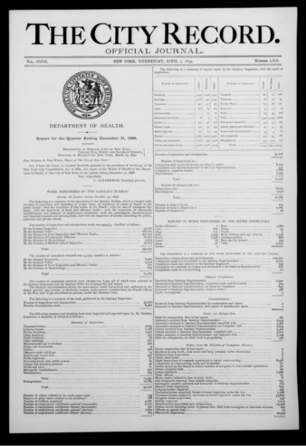 The City Record newspaper publishes notices which includes but is not limited to: public hearings and meetings, public auctions and sales, solicitations and awards and official rules proposed and adopted by city agencies. This is the City Record Newspaper for April 05, 1899.