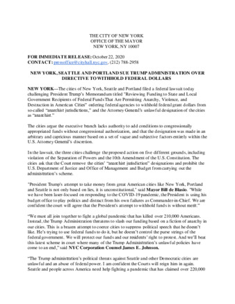 Mayor's Press Release: NEW YORK, SEATTLE AND PORTLAND SUE TRUMP ADMINISTRATION OVER DIRECTIVE TO WITHHOLD FEDERAL DOLLARS