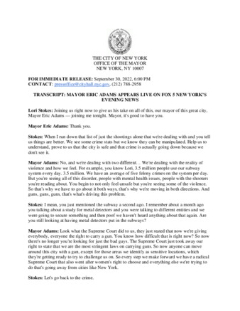 TRANSCRIPT: MAYOR ERIC ADAMS APPEARS LIVE ON FOX 5 NEW YORK’S EVENING NEWS
