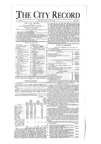 The City Record newspaper publishes notices which includes but is not limited to: public hearings and meetings, public auctions and sales, solicitations and awards and official rules proposed and adopted by city agencies. This is the City Record Newspaper for January 27, 1911.